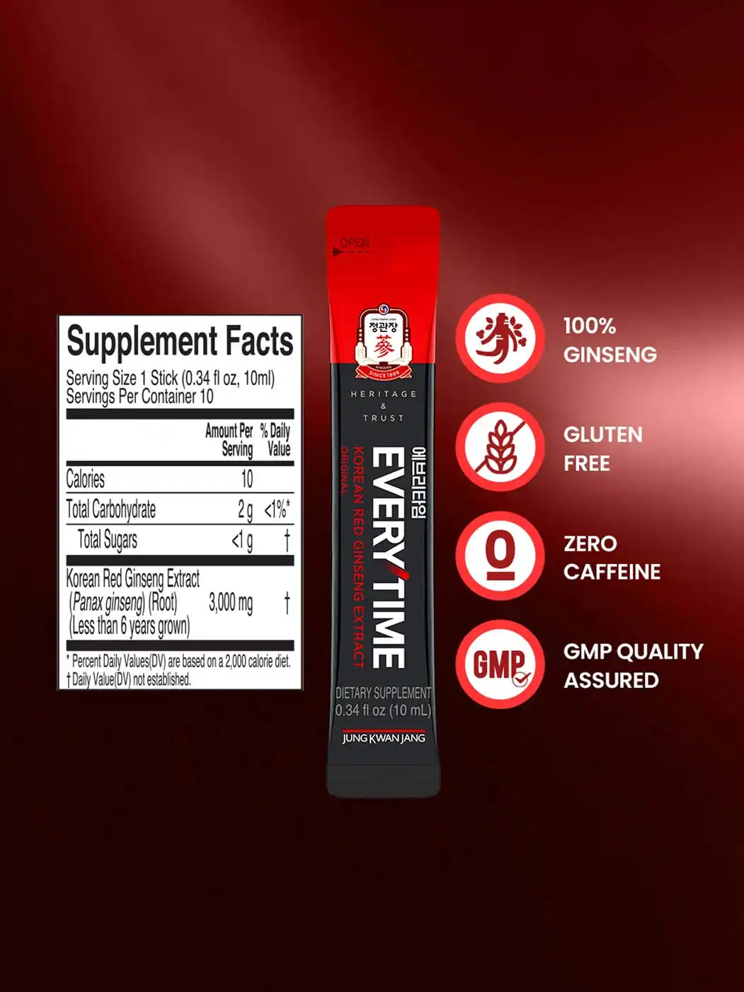 Experience natural vitality with Jung Kwan Jang Everytime Original, Korea’s #1 red ginseng extract in convenient stick packs.