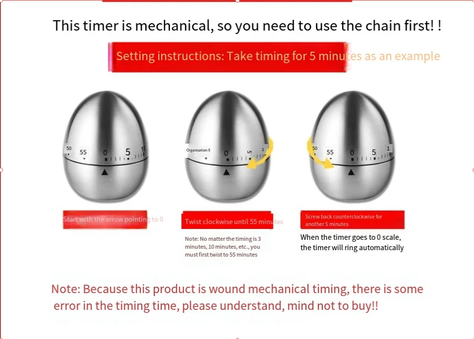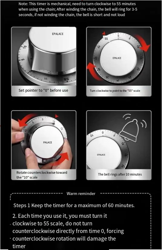 Because the timer is mechanical, clockwise twist to 55 minutes, the role of the chain, on the chain, the bell will play 3-5 seconds of the ring, played the role of reminder.
